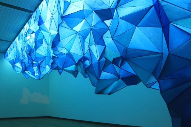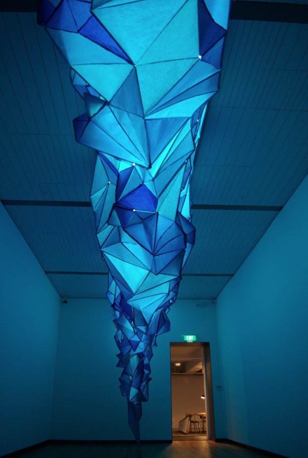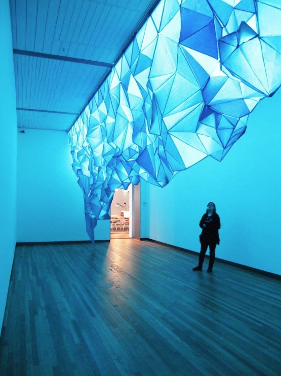 If you ever thought you needed fancy, expensive materials to make an impressive piece of art, then you haven't seen this sculpture by Gabby O'Connor. Called What Lies Beneath, it's a huge installation that resembles an iceberg. Hanging from a ceiling, it's made up of thousands of small paper triangles dyed in shades of blue-green, coated in shellac and then stapled together with thousands of staples. Similar to stained glass, light passes through the thin paper casting, albeit through tiny individual holes, creating a gorgeous glow inside the room. It's like you've stepped into an underwater world, looking at a massive iceberg from below.