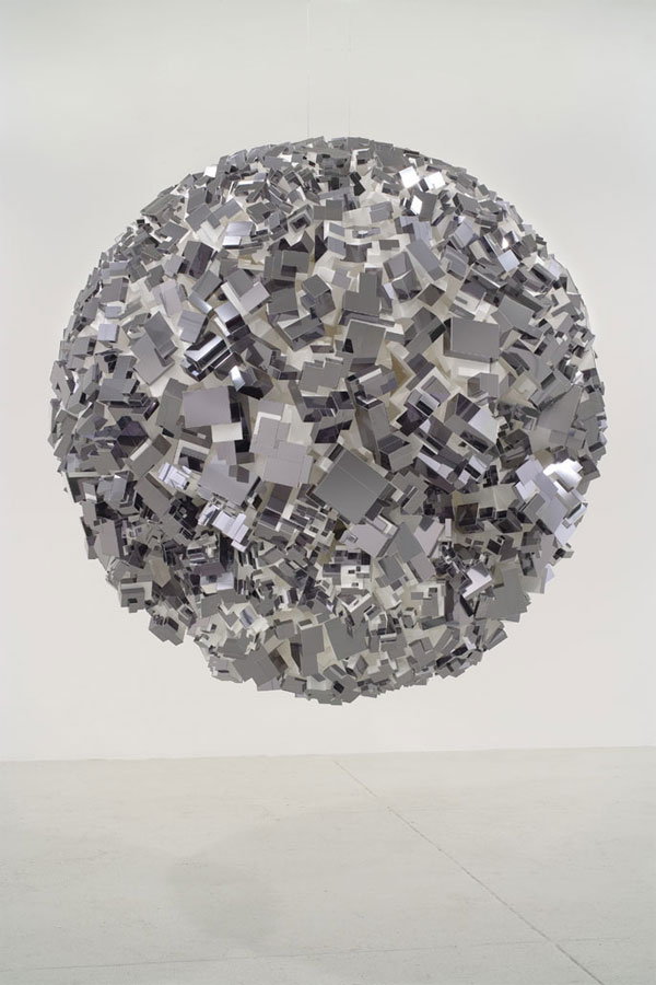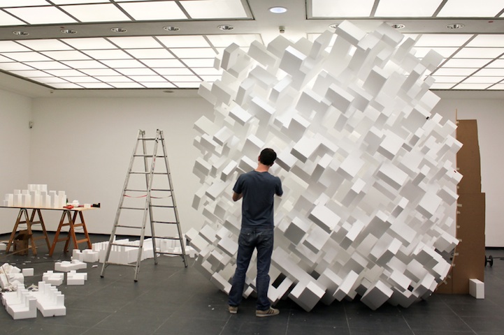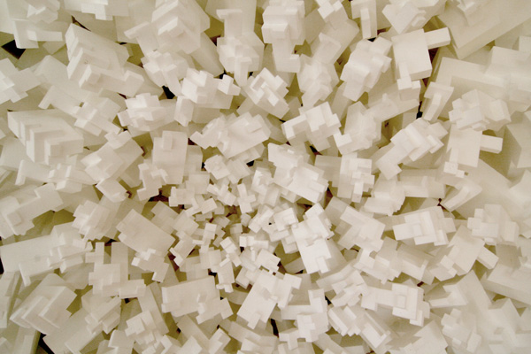 His pieces usually employ one specific type of material, most commonly Styrofoam blocks. In some of them, the intricately laid out blocks create images of mazes, prompting the viewer to try and navigate his work. He's also known to use wooden blocks and mirrors. Powers elaborates, “I love walking into an artist's studio and finding something that is made of junk or base stuff that moves me.”