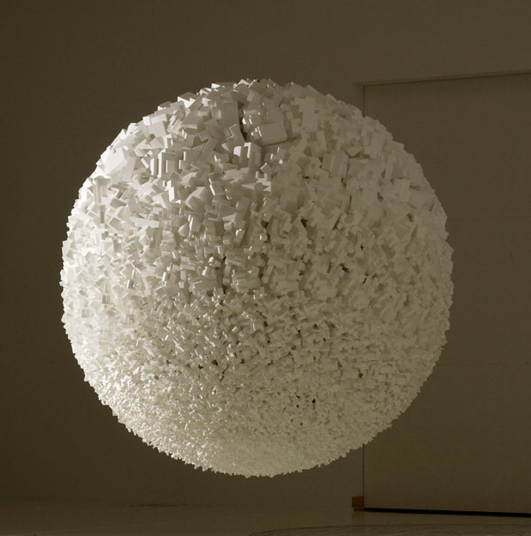 John Powers creates geometric installations and sculptures that use simple blocks to form interesting patterns with depth and form. The zoomed in view of these pieces makes them look like more like computer generated images than tangible art. Powers states, “I very much like that my work looks digital, that it reflect my exposure to the technologies around me, but I like also that it is handmade out of base materials.”
