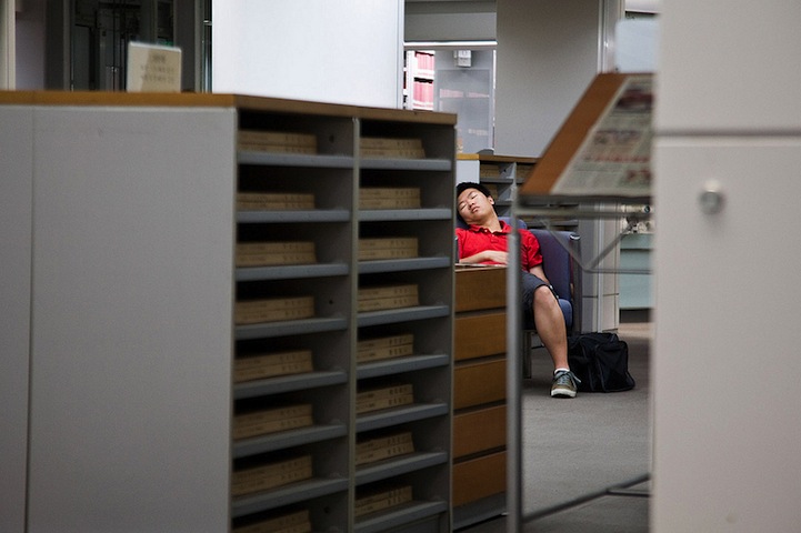 One could easily infer that these slumbering students and power napping persons have fallen prey to the Sandman while studying hard or simply being on their feet for too long. Whatever their reasons are for taking a break from consciousness, it's certainly a state of weariness that most can relate to. Who wouldn't want the option to hit the snooze button and escape into dreamland on a comfy chair in a quiet library?