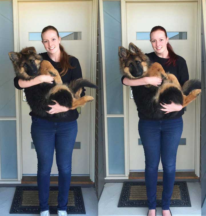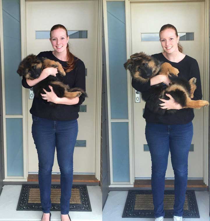 The puppy stage, while cute, doesn't last that long, and Australian couple Alex Dennison and Ashley Lewis can attest to this fact. They had the foresight to formally document the development of their German Shepherd puppy, Nasra. Starting from eight weeks old, they snapped pictures of Lewis holding her, compiling them in a single row, with the last image from when Nasra was eight months old. Her teddy bear-like appearance and massive size–she's almost as big as Lewis–took the internet by storm. Their photo has gone viral, and the world has officially fallen in love with the photogenic puppy.