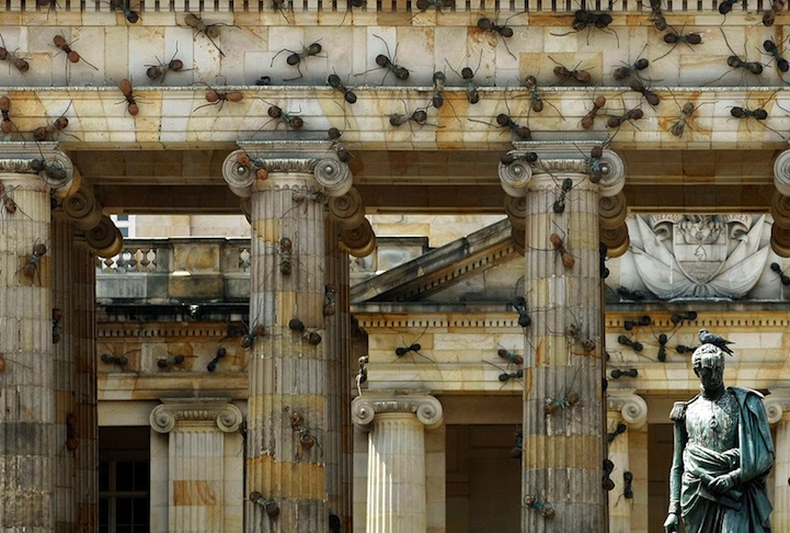 While a house taken over by ants usually leads to loud screaming and plans to immediately call an exterminator, the fiberglass ants covering the facade of the National Congress building in Botoga actually beckons viewers to come closer and take a better look.