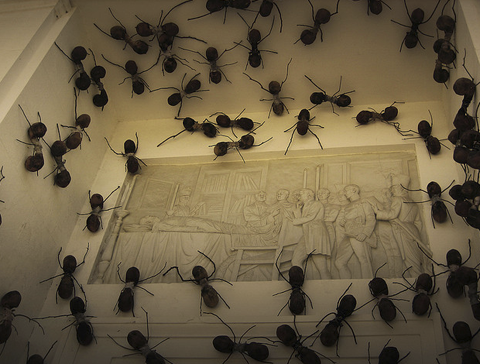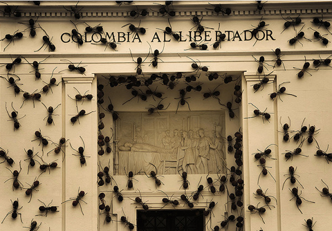 Artist Rafael Gomez Barros covered the building with 1,300 large fiberglass ants as a symbol: the ants represent those who were displaced due to the ongoing arms conflict in Colombia. He calls it Casa Tomada or House Taken Over which was inspired by a tale from Julio Cortzar. The story is of a brother and sister who live alone in an ancestral home and practically shut themselves in it until, one day, mysterious intruders force them out of their own house.