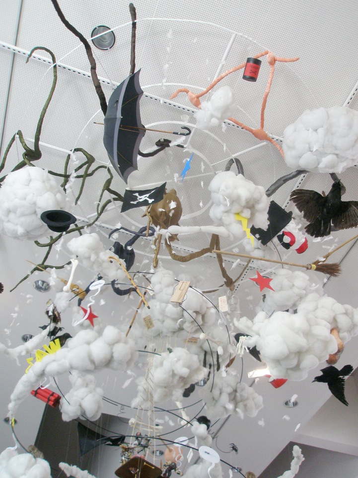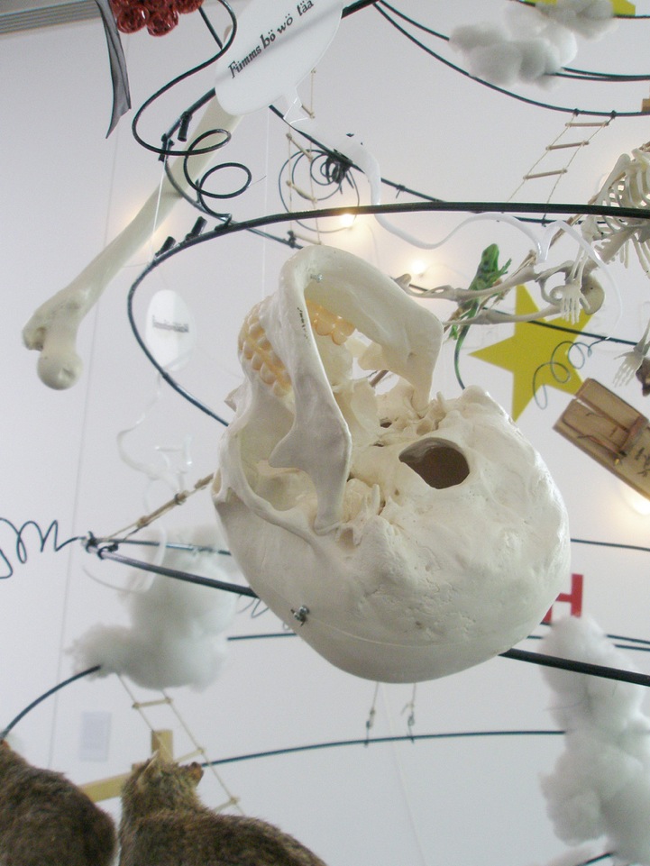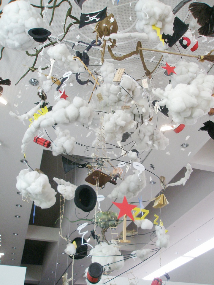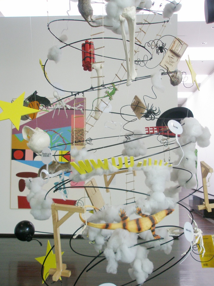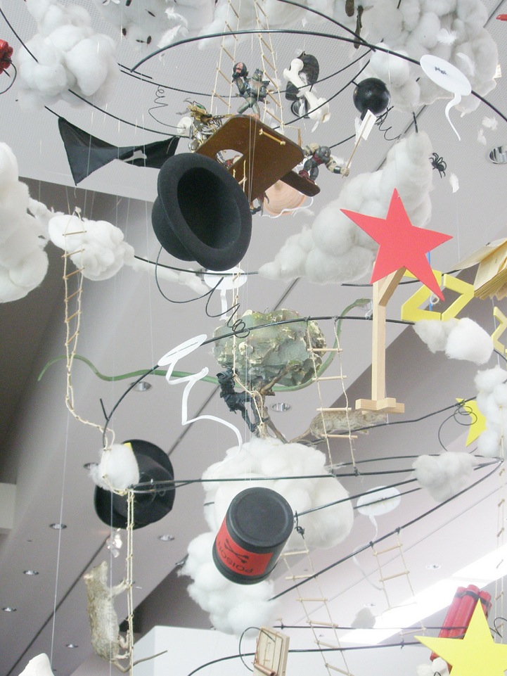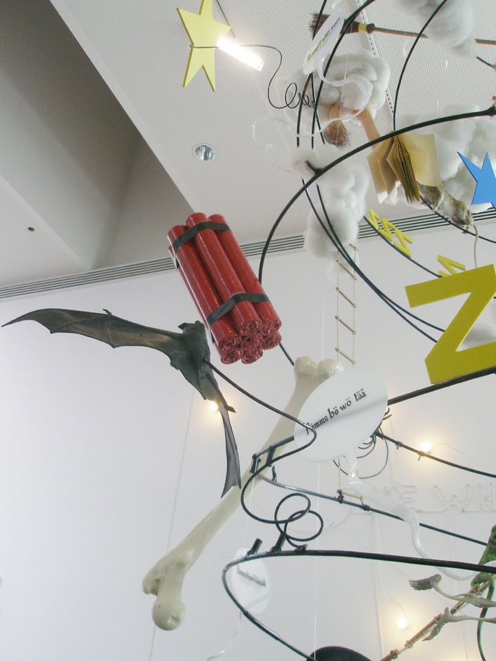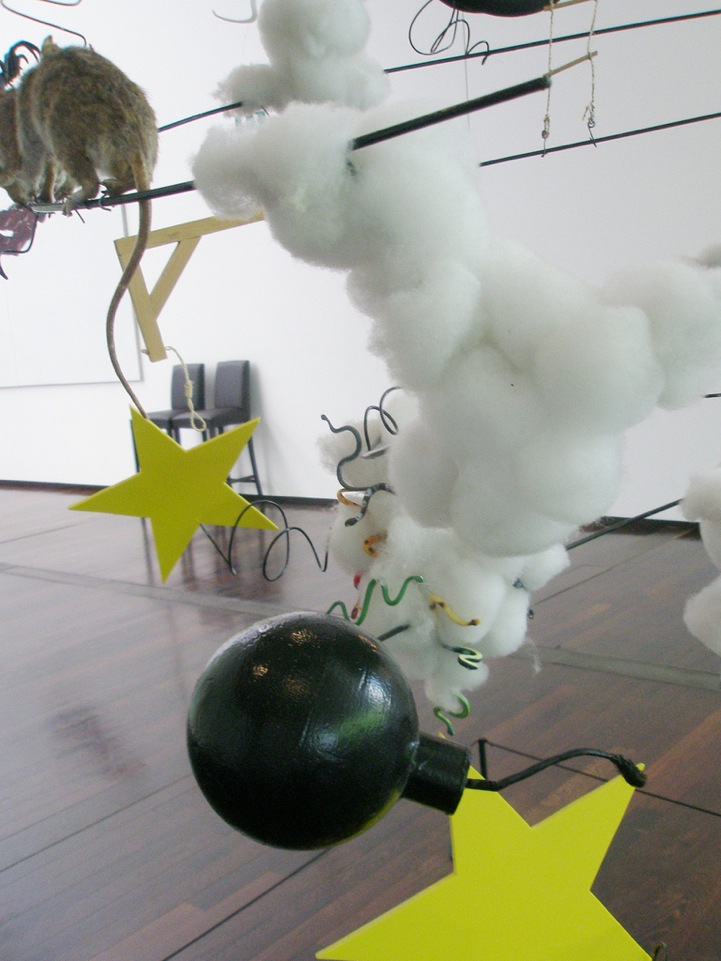 The metaphorical visual made of wax and mixed media displays a circus of objects ranging from dreamy stars and clouds to violent bombs and dynamite, not to mention the ominous crows and skulls. There's something sad yet lively about Barbier's work. Though the man appears to be going through a rough time, perhaps having fallen in his drunken stupor, his dizzying thoughts are filled with vivacious vigor. There's a cartoonish appeal to his winding imagination that can't be contained.