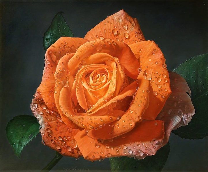 Each painting in Passini's impressive portfolio offers a realistic sense of depth. It may seem that the beads of water are an unnecessary addition, but they add a remarkable touch of hyperrealism. Up-close, you can see that Passini incorporates light and shadow into each water droplet to make viewers wonder if the sun's shining nearby. It feels as though you can reach out and pluck one of the painter's flowers right out of his workspace.