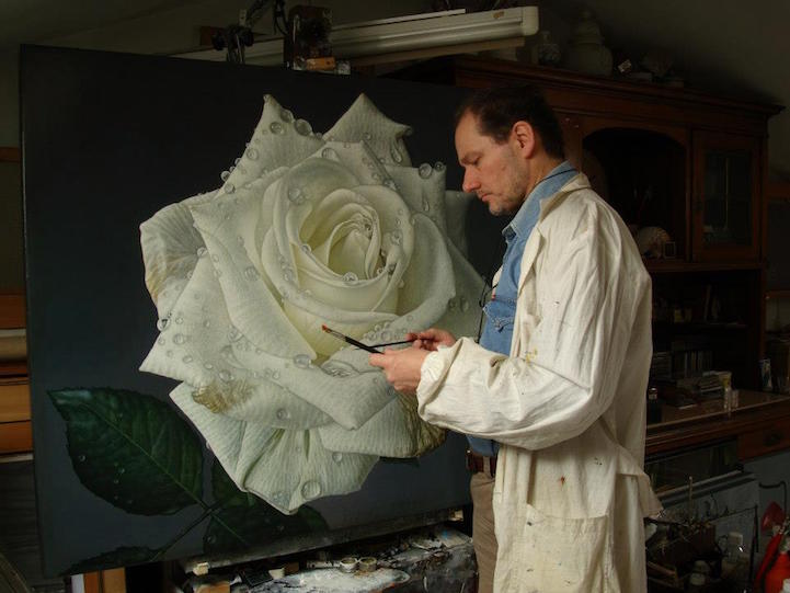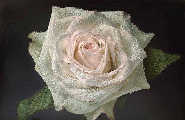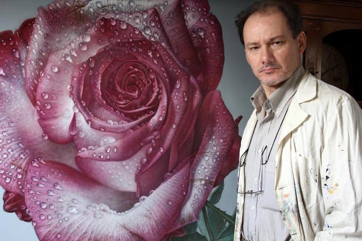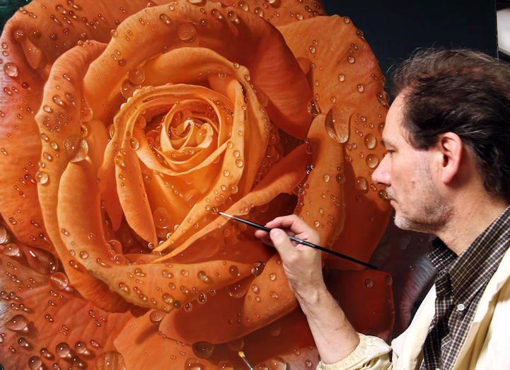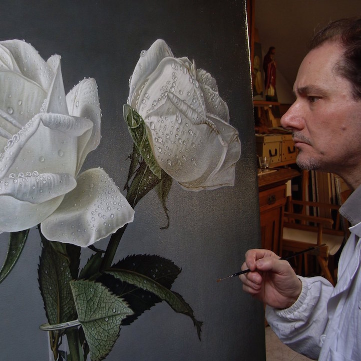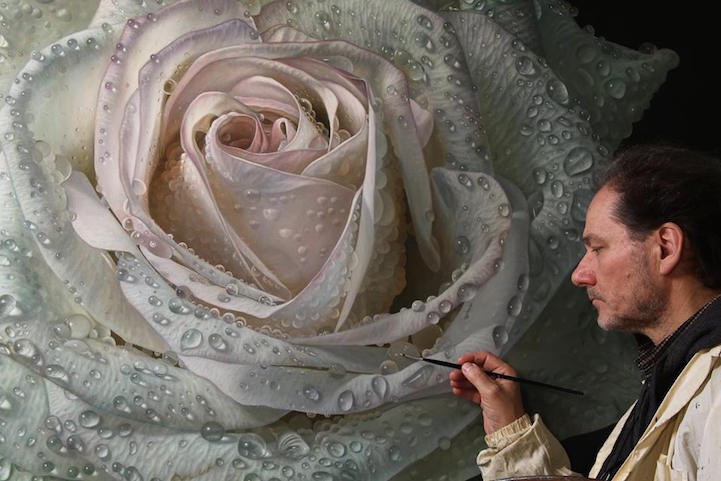 Artist Gioacchino Passini takes an ordinary blank canvas and transforms it into a larger-than-life garden of dewdrop-covered roses. The petals appear soft and supple, an effect that is heightened by the flowers' brilliant coloring. Passini's large-scale paintings not only offer audiences an in-depth look at the beauty of nature, but they're also a way for the artist himself to explore the minute details that tower above him as he paints.