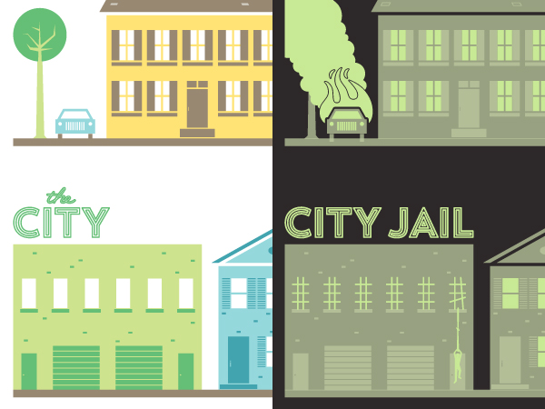Orlando-based designer Jason Dean just sent word about his latest poster that changes from day to night! The 9-color, glow-in-the-dark screen print shows a sunny little town during the day which turns into a seedy city at night. Check out the side by side close-ups to see scenes full of crime, sex, zombies and more. (Love how The City turns into City Jail.)