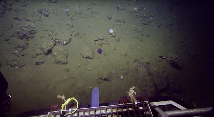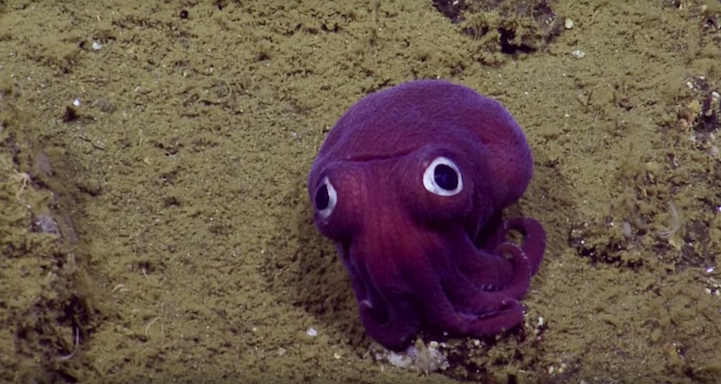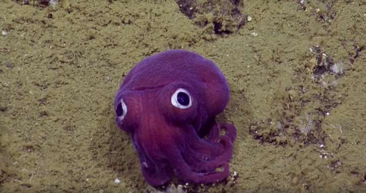E/V Nautilus, the team who spotted the creature, later discovered it’s called a Rossia pacifica or stubby squid. Although it looks like a combination of an octopus and squid, it’s actually more closely related to a cuttlefish. “This species spends life on the seafloor,” they write on YouTube, “activating a sticky mucus jacket and burrowing into the sediment to camouflage, leaving their eyes poking out to spot prey like shrimp and small fish.”