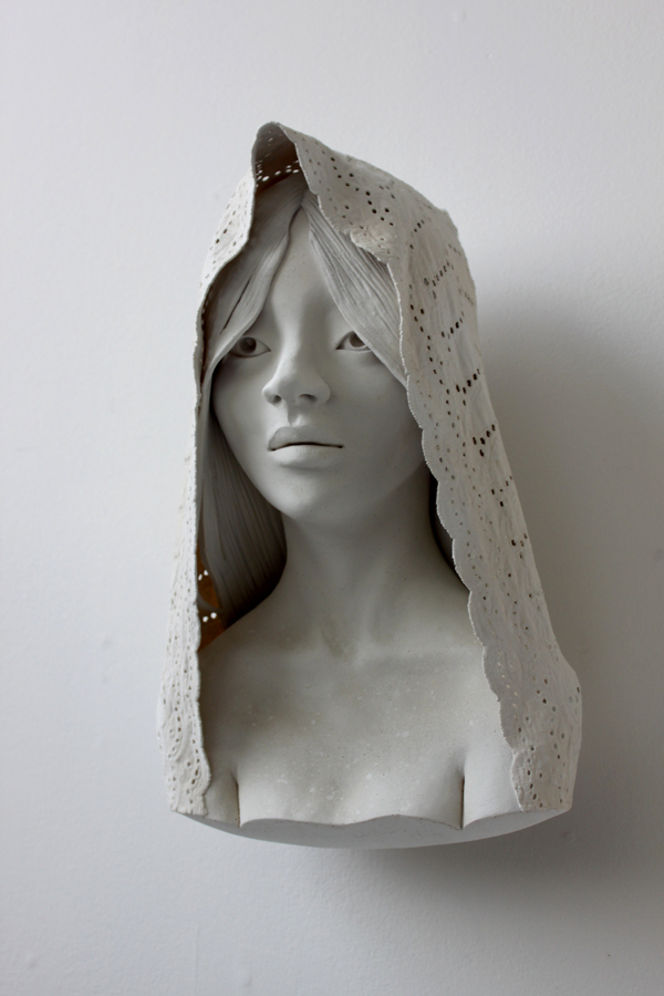 Having just recently completely three works in this ongoing series–respectively titled Pearl, Luna, and Eva–the artist's polymer clay and gypsum sculptures present the image of three different women, despite being cast out of the same mold. Gosia accomplishes this by hand-sculpting embellishments and fine details like her fabricated subject's hairstyle along with fabric and flowers to adorn it.