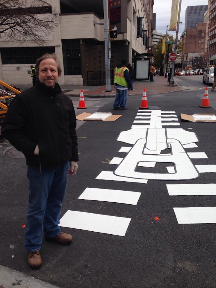 Artist Paul Bertholet overseeing the installation of his design for the Bromo Tower Arts & Entertainment District Crosswalk Project.