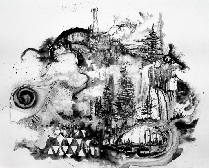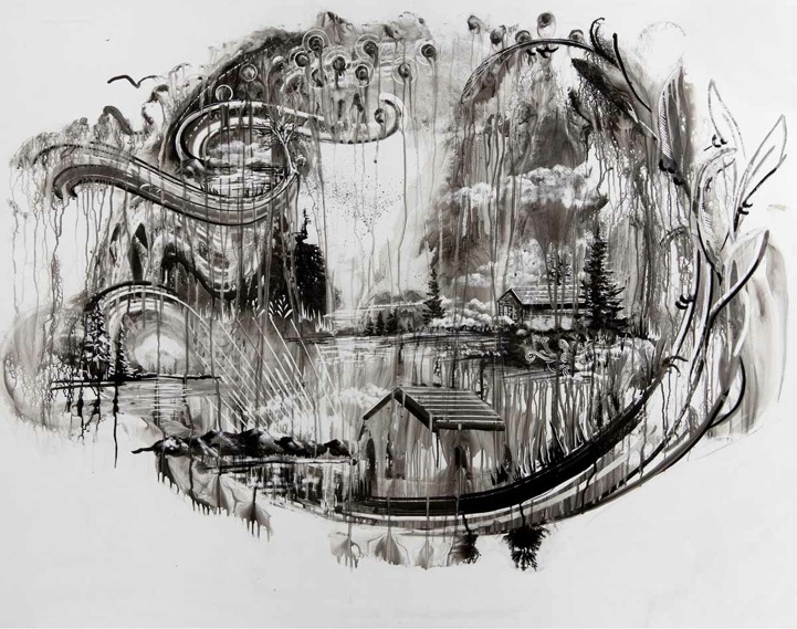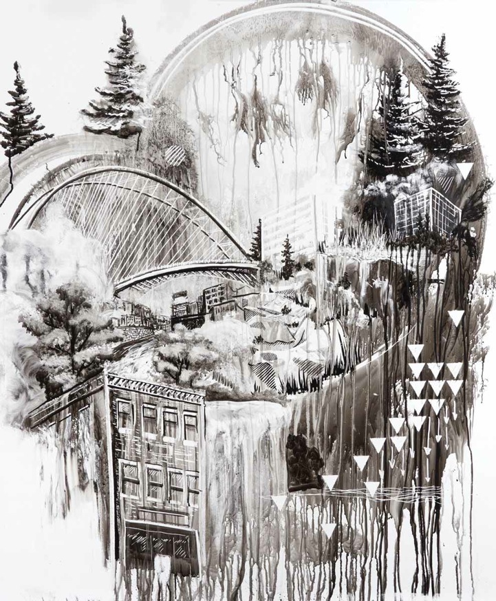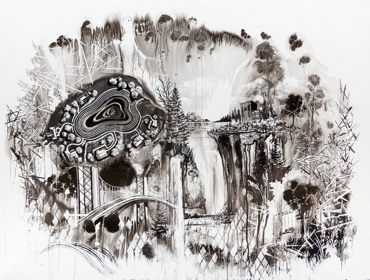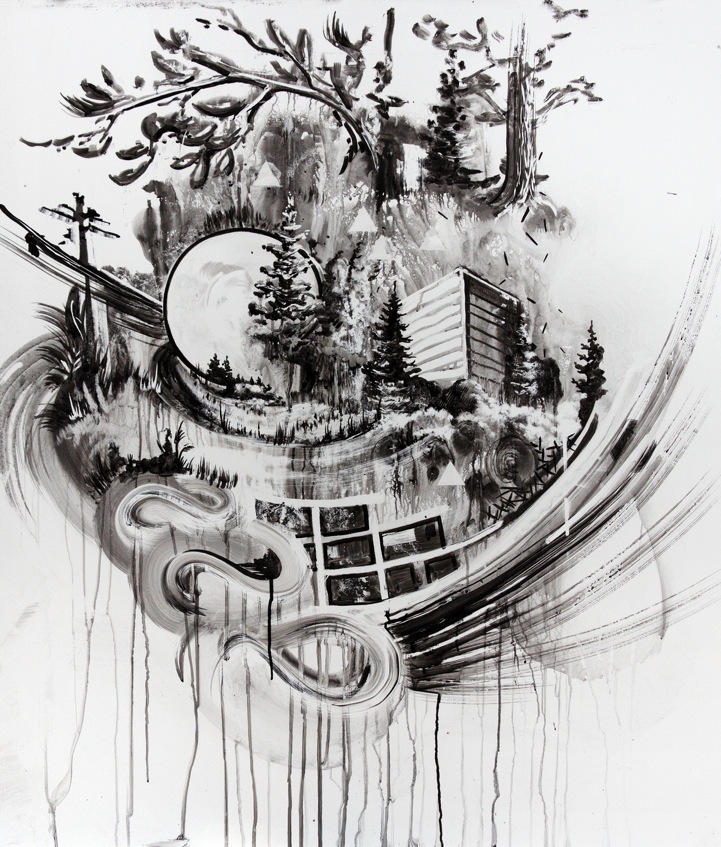 The project called Laid Down & Wiped Away presents a series of fantastical scenes that amalgamate natural landscapes and architectural environments. While these works may not literally jump out at you like his painting installations, they metaphorically invite the viewer to jump into them and get lost in their magical beauty. It's remarkable that Euclide was capable of producing such incredibly involved and detail-oriented pieces in the short period of time he allowed himself amidst the rest of the school day. His manipulation of the ink across the smooth surface of the board is brilliantly executed.