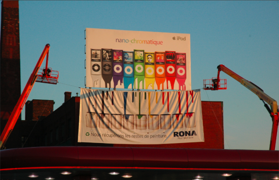A spectacularly brilliant idea! Rona, the largest Canadian retailer and distributor of hardware, renovation and gardening products, recently announced their used paint recovery program across its stores. “This new program for municipal hazardous or special waste, often called ‘household hazardous waste,' will help ensure that consumer products such as left over paints and solvents are collected so they can be reused and recycled,” said Glenda Gies, Executive Director of Waste Diversion Ontario. “RONA is playing an important role by accepting leftover paint at their Ontario retail locations.” In their advertising effort, they backpacked on top of Apple's billboard which showed dripped paint coming off of Apple's Nano. The RONA tagline reads, “Nous recuperons les restes de peinture.” Which translated from French to English says, “We collect leftover paint.” Did you notice that Rona matched up all the paint colors correctly? Almost as good as the BMW/Audi billboard fight, wouldn't you say? Via NotCot via Fubiz