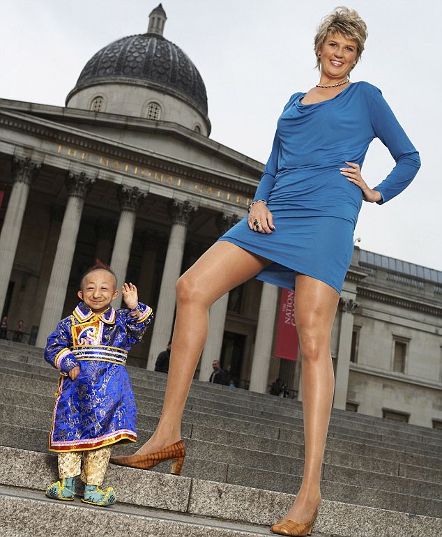 He Ping Ping, the world's smallest man, and Svetlana Pankratova, the woman with the longest legs in the world.