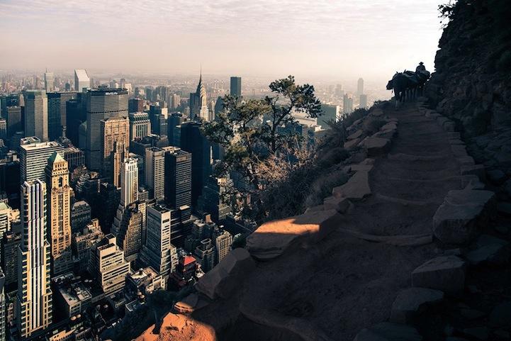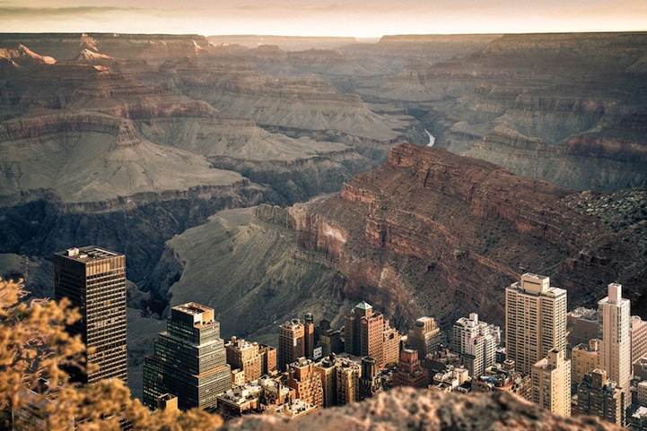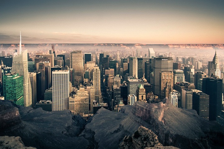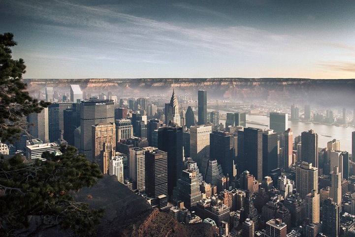 The most interesting and final installment of the three, Merge, combines the vast bleakness of the Grand Canyon with the bustling density of New York City. Essentially, the series places the city that never sleeps within the deep hollows of the Grand Canyon. The photographer manipulates his landscape images to create a new world were the two opposites coexist in close quarters.