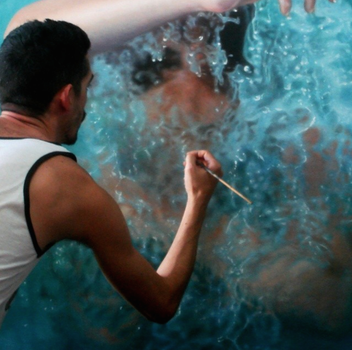 Nunez adds another dimension to the lifelike paintings with playful snapshots of himself interacting with his creations. Through his Instagram, the artist frequently shares glimpses of his works-in-progress as he poses with them, pretending to hold onto the subjects' arms or greet the swimmers as they break the water's surface for air. With the breathtaking level of hyperrealism in his works, it often becomes difficult to distinguish Nunez from his paintings, speaking to his incredible skills as an artist.