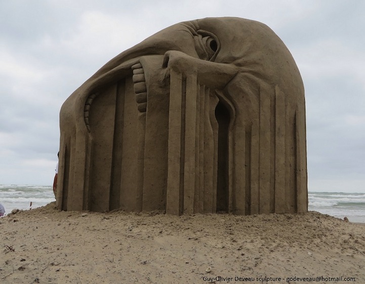 Bleeding is an incredibly eye-catching sand sculpture by Qubec City-based artist Guy-Olivier Deveau that features a resting head boasting undeniably surreal elements. Rather than depicting a calming, serene scene of a giant, slumbering head, the piece focuses on an open-mouthed man's head, seemingly screaming, lying on its side with one half of his face eerily distorted.