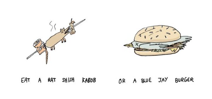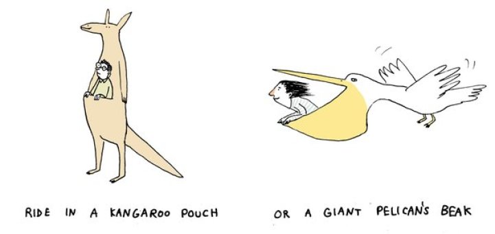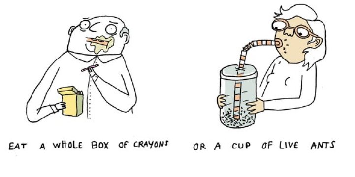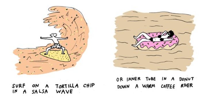 Every answer is a tough call, but the delight in the imaginative drawings is indisputable. Paired with loose hand-lettered captions, the side-by-side sketches inspire a gleefully goofy return to a curious, childlike mindset, in which no fantastical scenario is inconceivable—not even surfing on a tortilla chip in a salsa wave. See for yourself, and choose your own far-fetched conclusions, below.