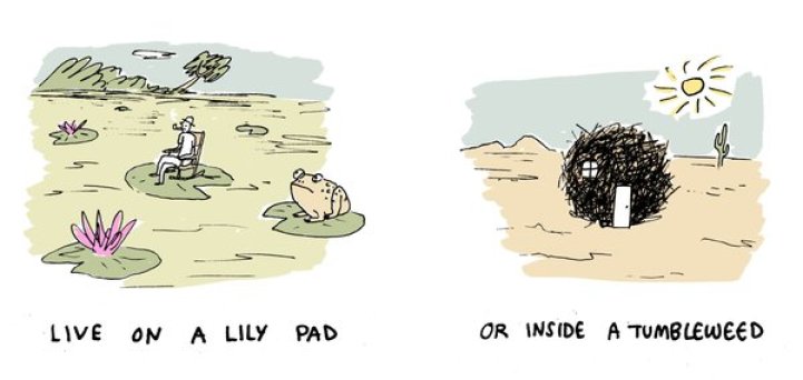 Writer and artist Hallie Bateman‘s Would You Rather? series comprises ten beguiling illustrations of life's big questions—like, would you rather wear clothes made of pizza or pancakes with syrup? Would you rather live on a lilypad or inside a tumbleweed?