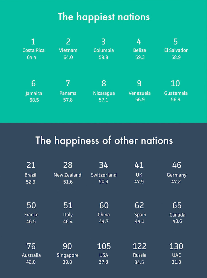The scale ranges in colors that correspond to low and high numbers. A deep red hue indicates a least-happy score that's between 20 and 30. It then transitions from orange to a light green, meaning a that's score between 61 and 65 on the HPI. According to this infographic, it appears that Costa Rica has everyone beat in terms of contentedness, and Vietnam is a close second.