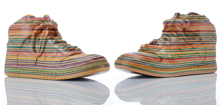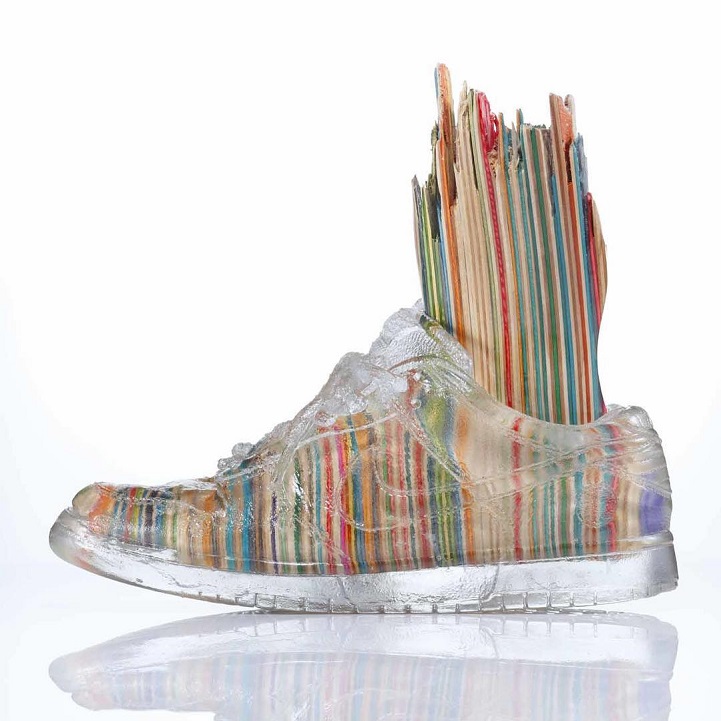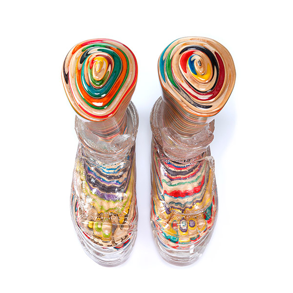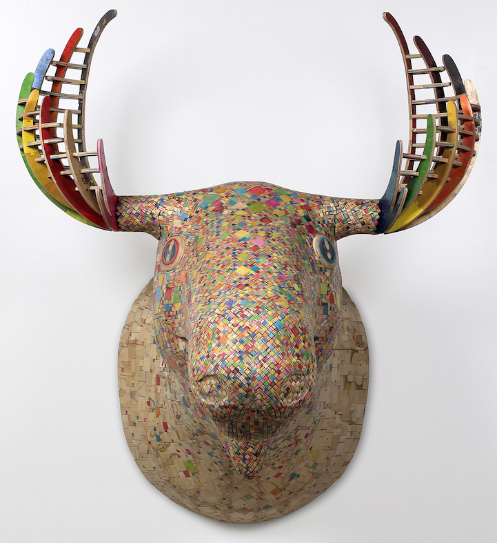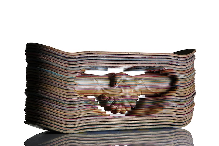 For over a decade, self-taught woodcarver Haroshi has been recycling old skateboard decks into magnificent multilayered works of art. Stacking, shaving, cutting, and carving the wooden decks together, he then paints and polishes the pieces to form colorfully streaked or pixelated mosaics that have a distinct, cheeky style which is utterly his own. A passionate skater since his early teens, the Tokyo-based mastermind is familiar with the workings of a skateboard and the curves that make up its essential design. As the contours of each board vary, depending on brand and model, his background helps him to seamlessly fit the board remnants together, allowing vibrant creations to be realized.