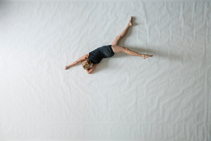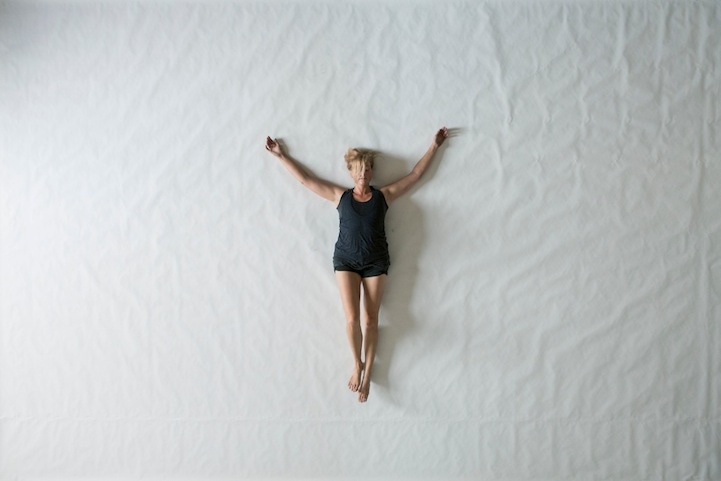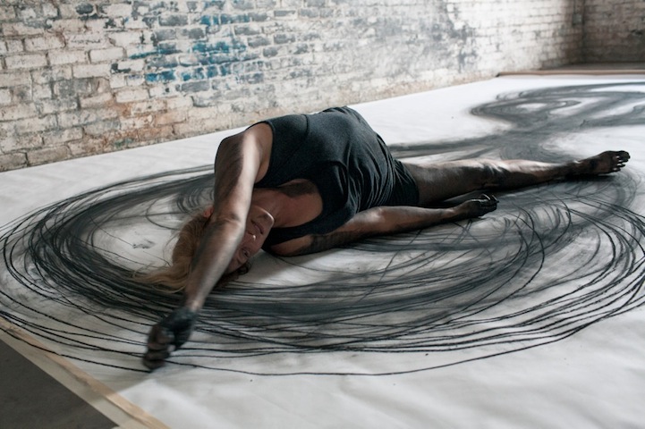 New Orleans-based visual artist Heather Hansen explores the combined art of painting and movement for her experimental project titled Emptied Gestures. Like a kinetic performance piece, the artist uses her own body to illustrate action on a two-dimensional surface. Rather than using any brushes or other tools to protect herself, Hansen gets down and dirty, shifting the dark pigment with her own body.
