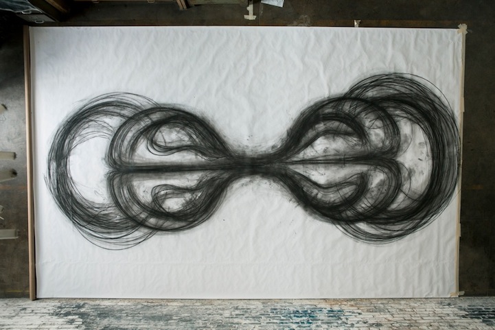 The piece is documented, step-by-step, by photographer Bryan Tarnowski who captures Hansen's brilliant dance-like movements. The artist's extended limbs manage to track and map their own movements onto the sheet beneath her. Hansen says, “In this series, I am searching for ways to download my movement directly onto paper, emptying gestures from one form to another and creating something new in the process.”