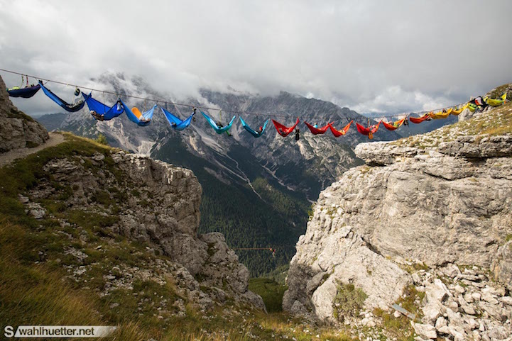 Since the first meeting was organized by co-founders Alessandro d'Emilia and Armin Holzer in 2012, thrill-seekers have gravitated towards the Dolomites each year for the chance to slackline between mountain peaks, hang out in hammocks suspended hundreds of feet above the ground, and meet like-minded people. This time, however, the event was even more poignant because of the 100-year anniversary of the conflicts near Monte Piana. To remember those who died on the field a century ago, Ticket to the Moon coordinated a special “Rainbow Warriors” session as a symbol of peace and a tribute to the past. 26 athletes came together to sing, laugh, and lounge in 17 colorful hammocks strung up high in the sky. “Just a hundred years ago, winters up here were characterized by bombs, grenades, and lots of pain,” d'Emilia and Holzer explained. “Our idea was to re-experience Monte Piana in friendship and peace with each other, accompanied by kindhearted feelings during the day, and lulled to sleep at night by magical silence.”