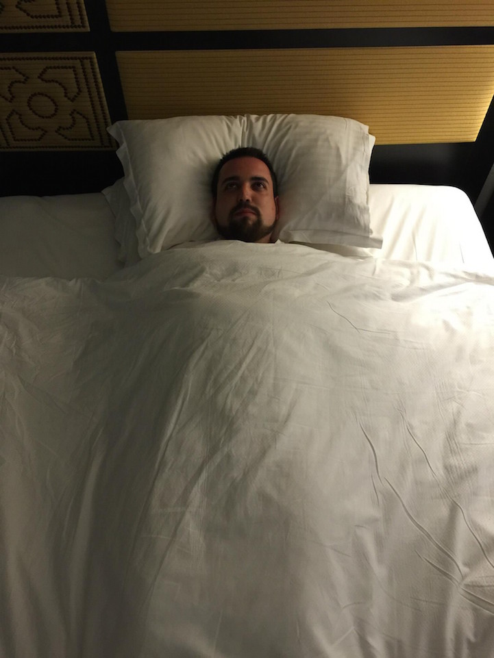 At the airport, Alec took a picture of his traveling companion and when the pair reviewed it, they broke out laughing because he looked completely miserable in the snapshot. Inspired by this hilarious image, the two friends decided to continue with this theme and create a photo series entitled “Not a single second of fun in Puerto Rico” to show Blandford's wife that he was miserable without her and his daughter there.