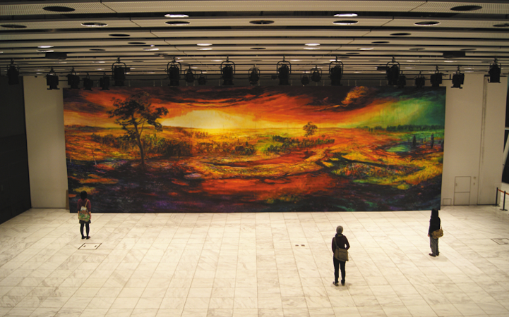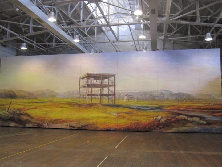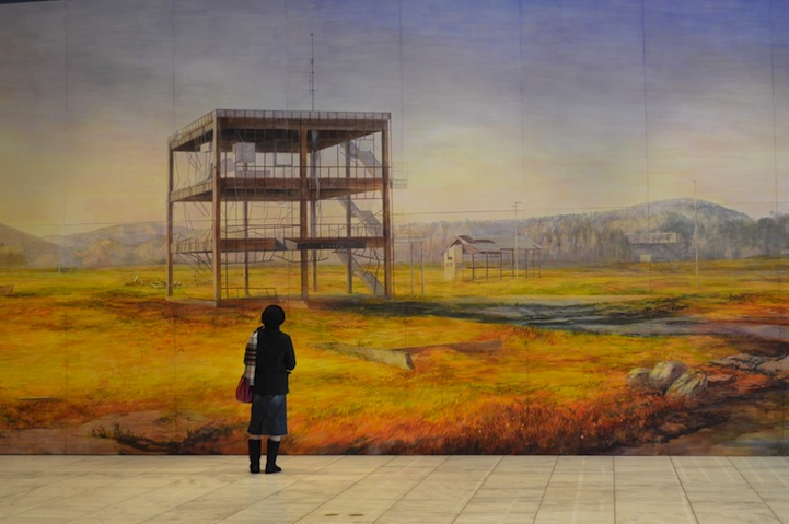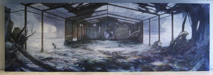 Japan-based artist Hiroshige Kagawa masterfully creates large-scale paintings that beautifully depict poignant scenes of destruction and desolation. His surreal landscapes show abandoned buildings crumbling with the passage of time and intriguing, forgotten structures standing amid windswept fields. The indoor murals have average dimensions of about 20 feet by 50 feet.