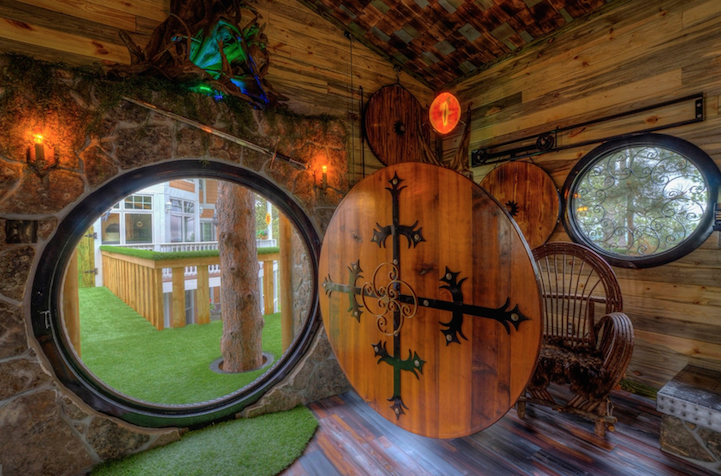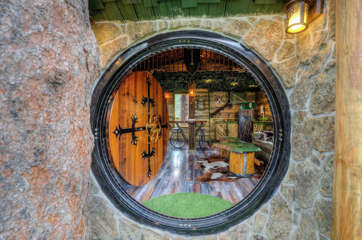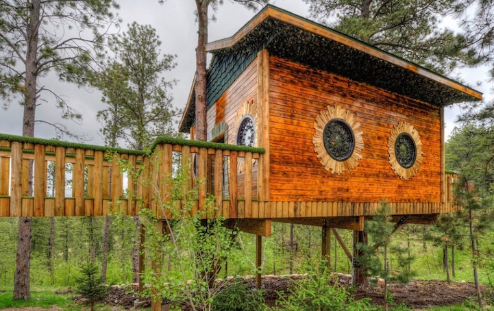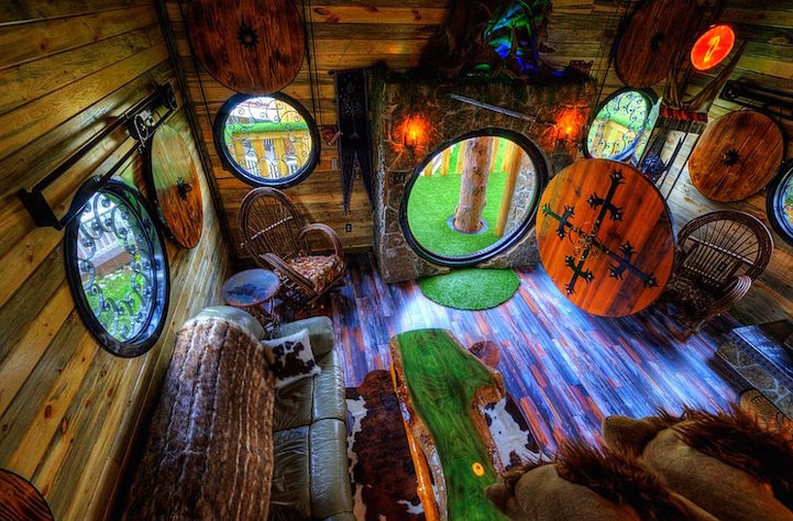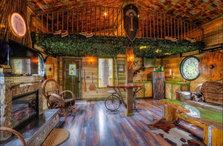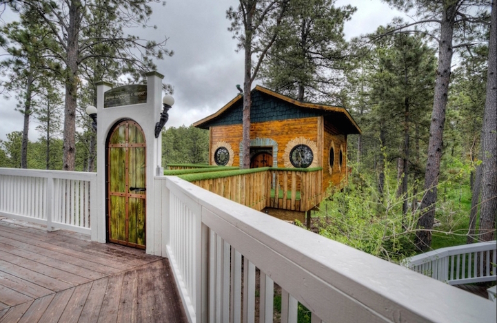 Located in the Black Hills of South Dakota is a place perfect for any fan of Middle Earth. Nicknamed the Hobbit treehouse, this elevated rental property is owned by Gordon Mack, a man who was inspired by the beloved Lord of the Rings films. Perched 16 feet above the ground, the structure has rounded doors and windows, with an interior space that'll make Tolkien devotees swoon, by including details like: Elvish-language signs; a mask worn by Sauron; and a gauntlet with the gold ring. There are even Hobbit-feet slippers that are specially tailored for all age groups.
