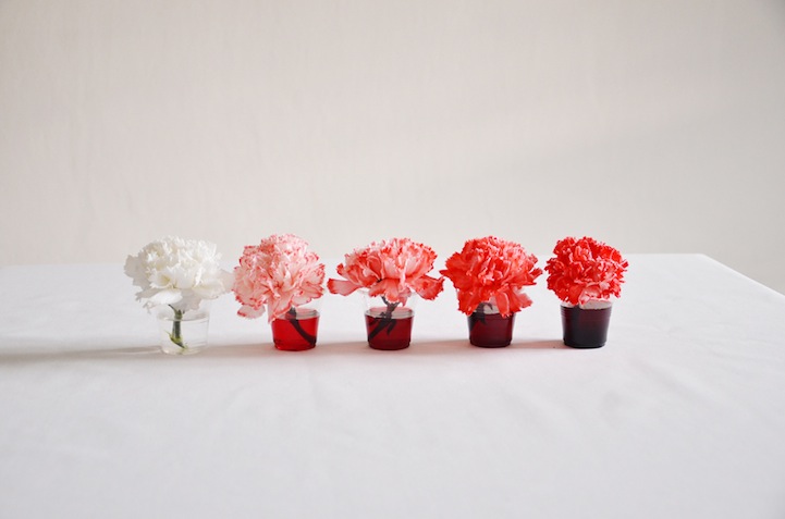 After watching a movie that featured Aung San Suu Kyi's struggles and fight for a democratic Burma, Red was inspired to capture the essence of such a strong woman who sacrificed so much in her life. Using fresh carnations and red food dye, the artist experimented with variations of shades of color as the food dye absorbed up into the petals of the flowers. She found that short stems resulted in the faster appearance of color and that although color would begin to appear after about a half hour, it took approximately 40 hours for the colors to reach maximum intensity.