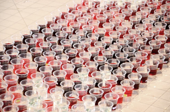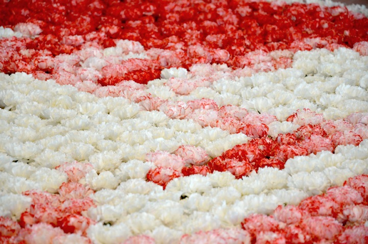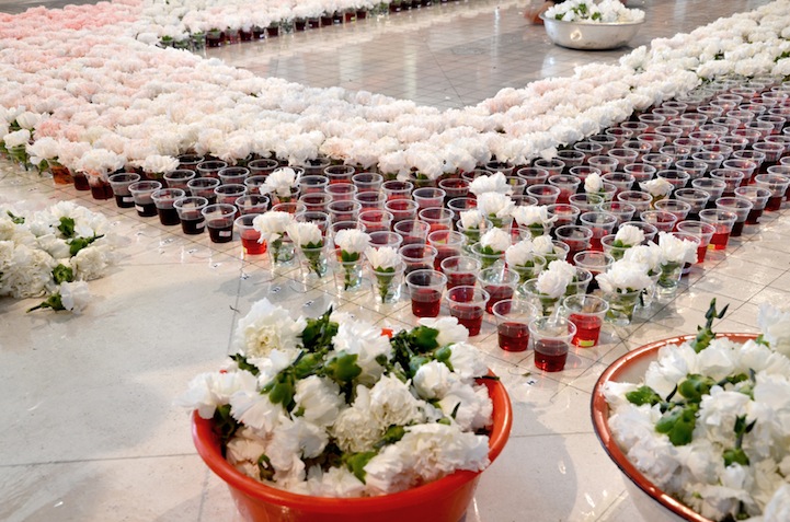 This visually striking piece is 11.5×14.75 feet and involves 2,000 white carnations held in little plastic cups. Red said, “I hope the portrait does justice to ASSK, and I hope she will see this portrait some day and smile, knowing that not only the Burmese people appreciate and respect her, but hundreds of millions of people around the world too.”