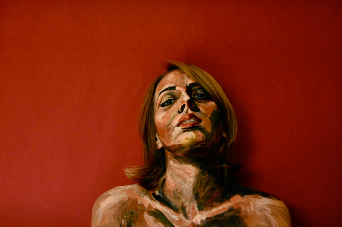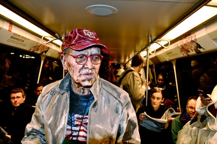 “I paint representational portraits directly on top of the people I am representing. The models are transformed into embodiments of the artist's interpretation of their essence. When captured on film, the living, breathing people underneath the paint disappear, overshadowed by the masks of themselves.”