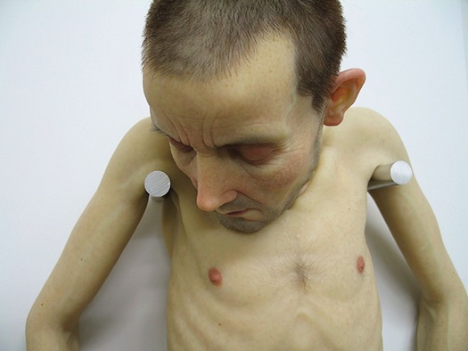 While we've now seen our share of hyperrealistic sculptures, Sam Jinks' are in a league of their own. An Australian sculptor who used to work in film and television special effects, Jinks not only creates unbelievably realistic sculptures, he's also the master of making us remember our own mortality. Made of silicone, fiberglass and human hair, his stunning sculptures appear in various stages of their life. In fact, take a look at the first sculpture, of an older woman and child, and you'll notice their tight embrace. As two humans who are at the beginning and end of their life stages, the sculpture highlights our own human fragility. What is the relationship between the older woman and the baby? Is the woman clinging onto her youthful past?