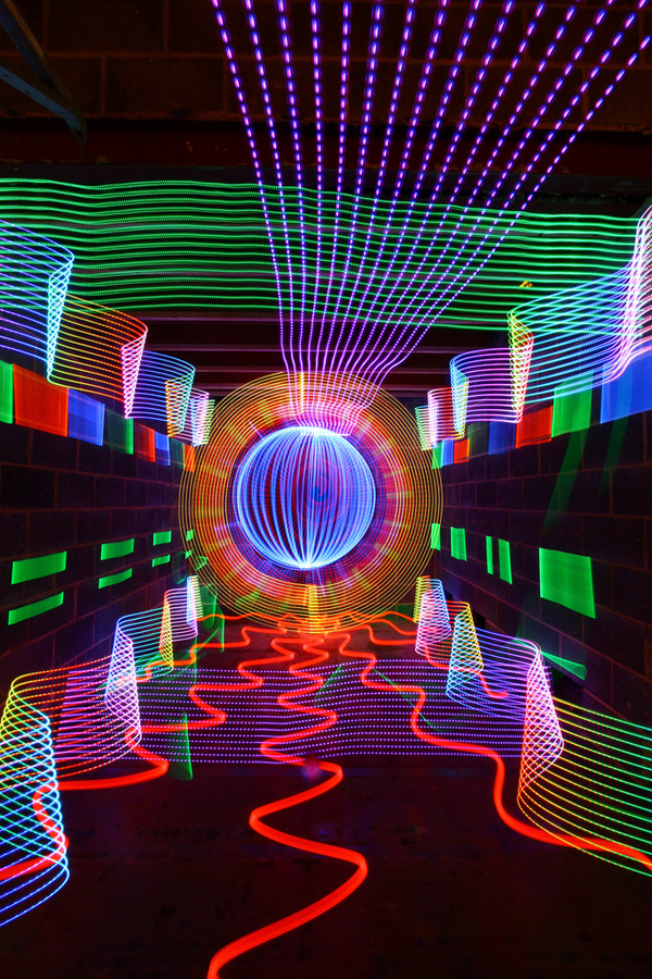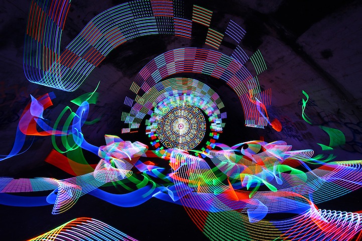 Hobson's complex spectacles of light combine waves, streaks, and swirls to form an image filled with trippy patterns of color. The trick to this work is the use of very long exposures to capture the variety of light streaks that he places in front of the lens. Hobson uses all kinds of light sources to create these unique images, ranging from battery powered, handheld light tubes in all colors, to flaming wool tossed into the air. The final results are incredible designs that will take your breath away!