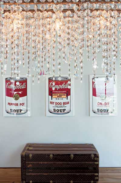 In rapper Kanye West's Los Angeles kitchen, Desiderata Design installed Ivan Lolli and Mario Memmoli's crystal chandelier above Andy Warhol's Campbell's Soup silk screens and an 1870's Louis Vuitton steamer trunk.