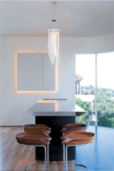 The kitchen's lacquered cabinet, backlit by miniature xenon lamps, faces Norbert Wangen's bar-island in stainless steel, paired with walnut stools.