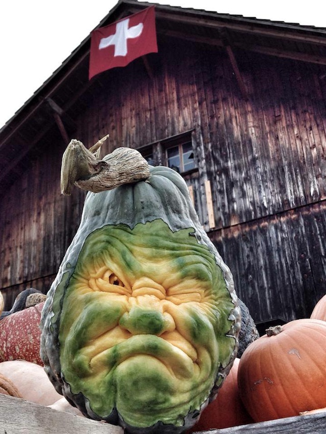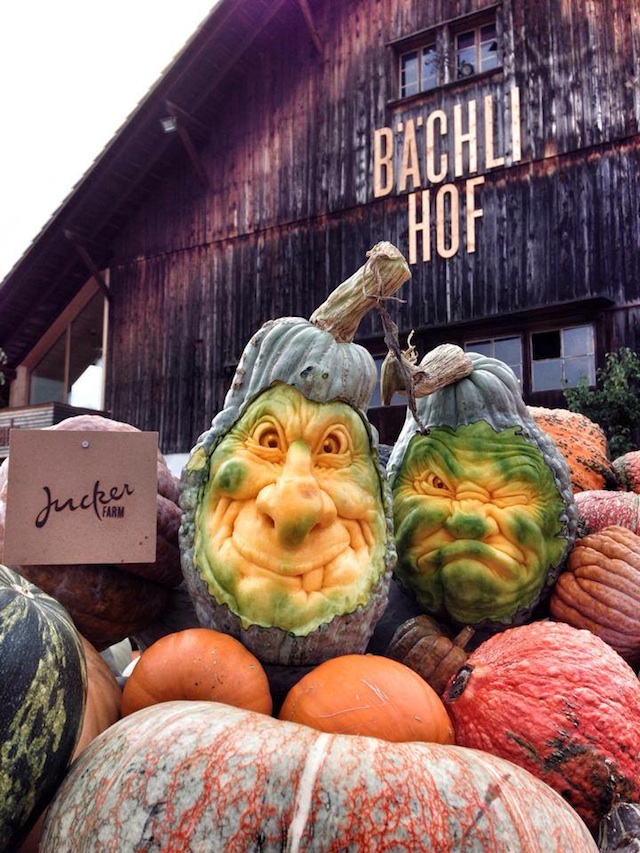 From September 26 to 29th, Villafane then hopped on over to the Jucker Farm in Zurich, Switzerland, where he spent the last few days carving more hubbards. As he stated about the pieces immediately below, “Meet the Hubbards. Hans and Heinrich Hubbard. I really love working with these Hubbard squash. A refreshing break from the standard pumpkin.