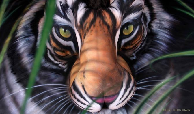 Craig Tracy is hands-down one of the best body painters in the world. At first glance, this piece looks like a simple painting of a tiger. Look a little closer, and you'll notice that the tiger's face is actually painted on the back of three separate women.