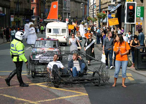 One of my favorite images is where Benedict Radcliffe and Ben Wilson are riding in their two-person peddle power Lamborghini Countach and a traffic cop looks over at them in bewilderment. In their words, “the work questions the combustion engine, celebrates bicycle efficiency, and the striking design of the Lamborghini [is] arguably one of the most iconic super cars of all time…”