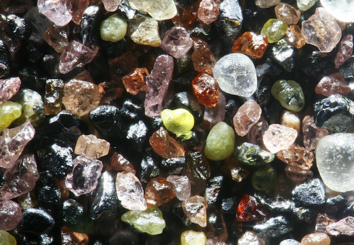 Viewed at an astounding magnification of over 250 times, tiny grains of sand are surprisingly colorful and extremely unique. Each piece is either a fragment of crystals, spiral fragments of shells or crumbs of volcanic rock.