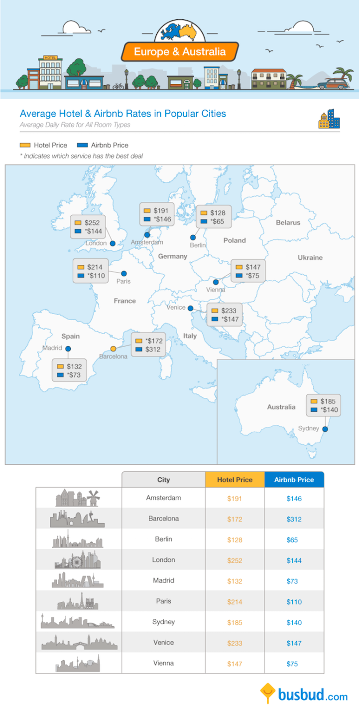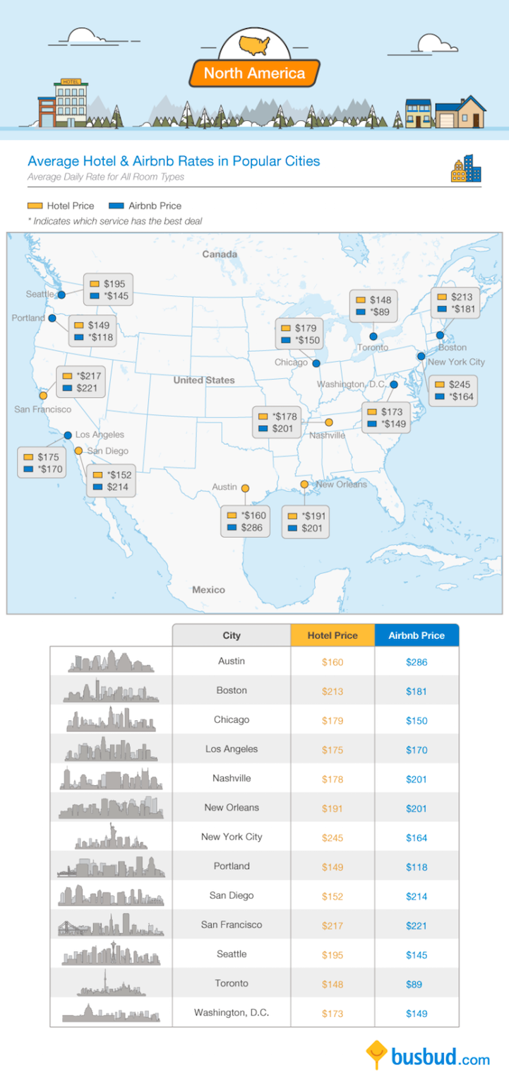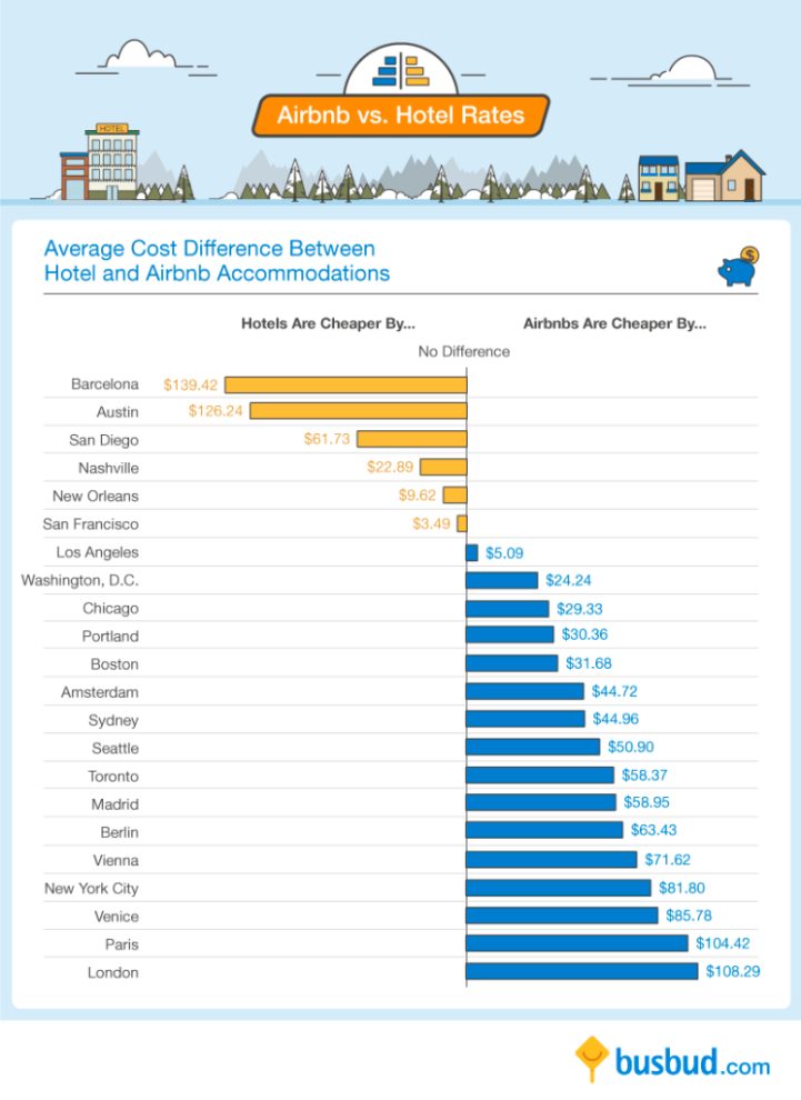 Thanks to Airbnb, travelers have seemingly infinite possibilities of places to stay. The home-sharing site offers all types of dwellings, from opulent estates to a modest bedroom in someone's apartment. Typically, Airbnb seems like it has the best rates for budget-conscious sightseers–especially when compared with a conventional hotel. But, are you really getting the better deal? Busbud, a website that compares and books bus tickets, created a helpful infographic that analyzes the cost of booking an Airbnb versus a hotel room.