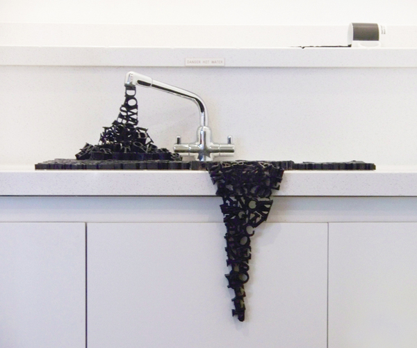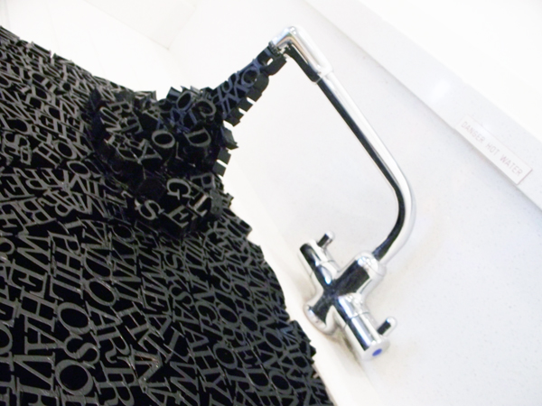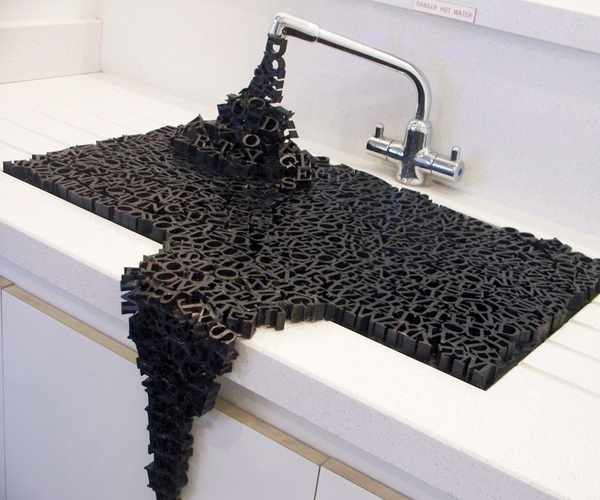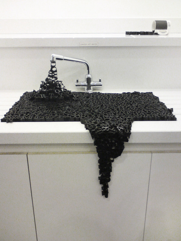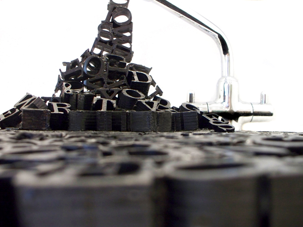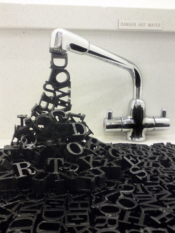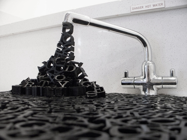 27-year-old Richard Evans created Information Leak to represent information overload in today's society. The typographic artwork appears to be flowing out like tap water in an ordinary kitchen sink. All the letters are hand-painted and laser-cut from wood, then arranged in an appropriate manner to get the flowing effect.
