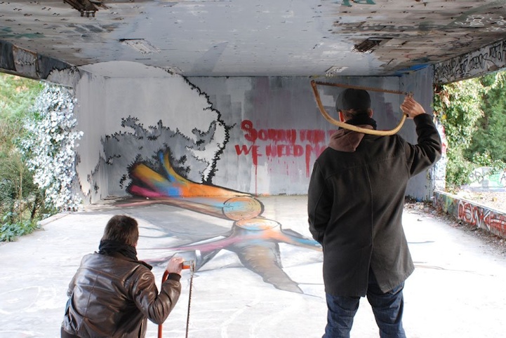 Papy and Milouz from the TSF Crew created this amazing floor to ceiling graffiti tree and then later proceeded to “cut it down”! On the side of this anamorphic piece it reads “Sorry For The Tree We Need More Space.” On one side, don't you just love how they spray-painted some real trees white, to match the painting? Also, notice how those in the photo are carrying saws! [Link]