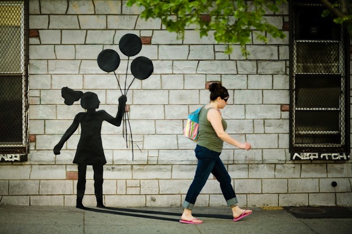 The Shadow Project, by Katie Sokoler, makes us see our whimsical selves! Sokolor cut out human forms from black paper and taped them onto the walls and sidewalks all around Brooklyn, New York. She then waited patiently for people to walk by and snapped a picture of them at the exact moment they matched up with their shadow. [Link]