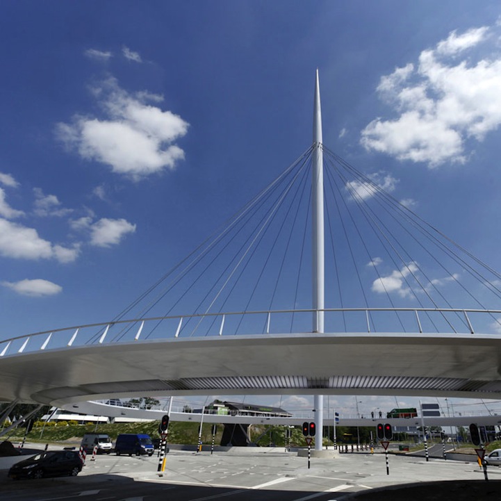 Hovenring is an incredible suspended roundabout conceptualized and designed by IPV Delft specifically for cyclists to safely make their way across congested traffic by traveling overhead. Located between Eindhoven and Veldhoven in the Netherlands, above the Heerbaan/Meerenakkerweg intersection, the circular steel bridge offers an alternative route for cyclists as well as an aesthetically pleasing landmark for locals and visitors.
