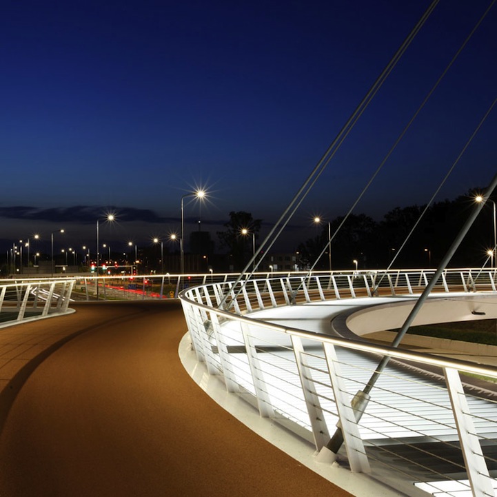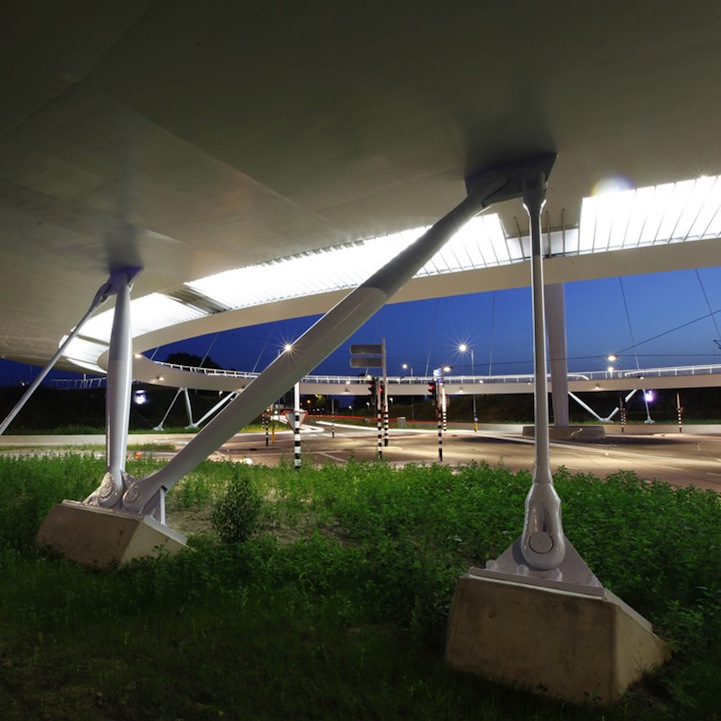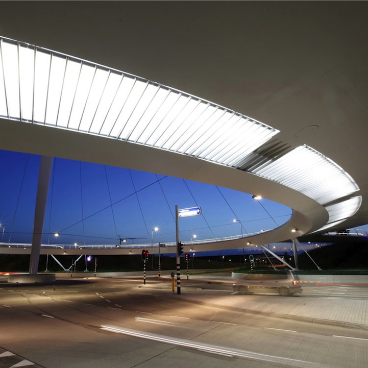 The structure adds an intriguing sight to the landscape that includes a pylon that soars approximately 230 feet high with 24 steel cables attached to it, holding the circular pathway up like a hovering saucer. It offers a spectacular view both in daylight and at night, when its lights are lit up. In addition to its unique, eye-catching design, Hovenring is a successful step in the evolution of architecture. Being the very first of its kind, the bicycle path offers an innovative approach to future road designs focused on efficiency and safety.
