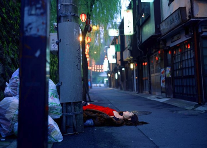 First using a long lens, he documents the moment from quite a distance. It's not always instantly clear what is happening in the scenes, but upon closer inspection, viewers will realize that they are witnessing a disturbing, fictional murder scene. Then gradually, in an additional three or four photographs, Kaoru moves closer to the subject until the final shot is an up-close detailed portrait.