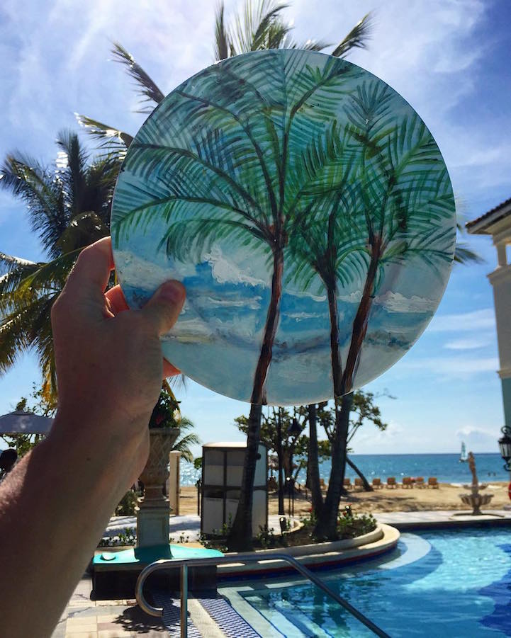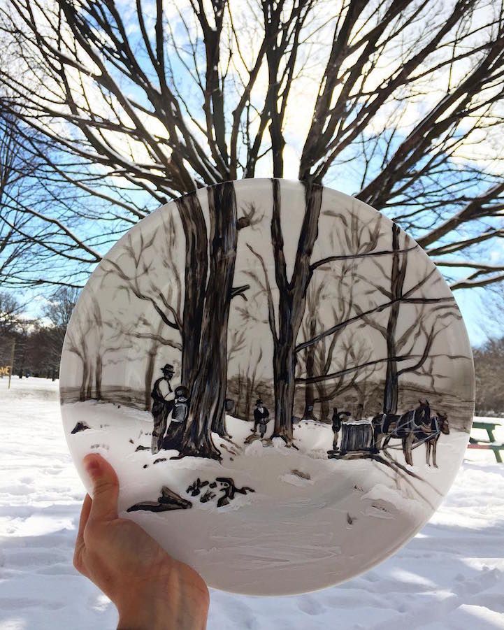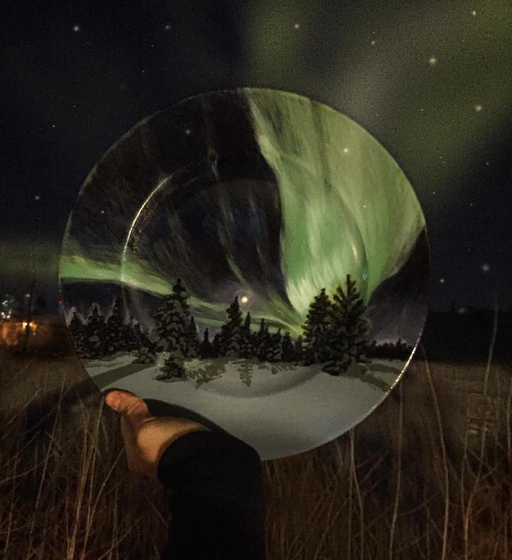 Artist Jacqueline Poirier (aka The Crazy Plate Lady) uses her imagination to travel the world with an unconventional canvas. Utilizing stark white, ceramic dinner plates, the artist paints incredibly detailed, realistic landscapes upon them. For the most part, Poirier will design scenes that match actual landscapes she has before her, which results in a highly impressive photograph. Otherwise, she'll take her creations out into the world as she aspires to find a backdrop that matches up with the lines and colors on her plate. Plus, Poirier isn't afraid to get even more creative by painting her workspace as an extension of the landscape that's on her plate.