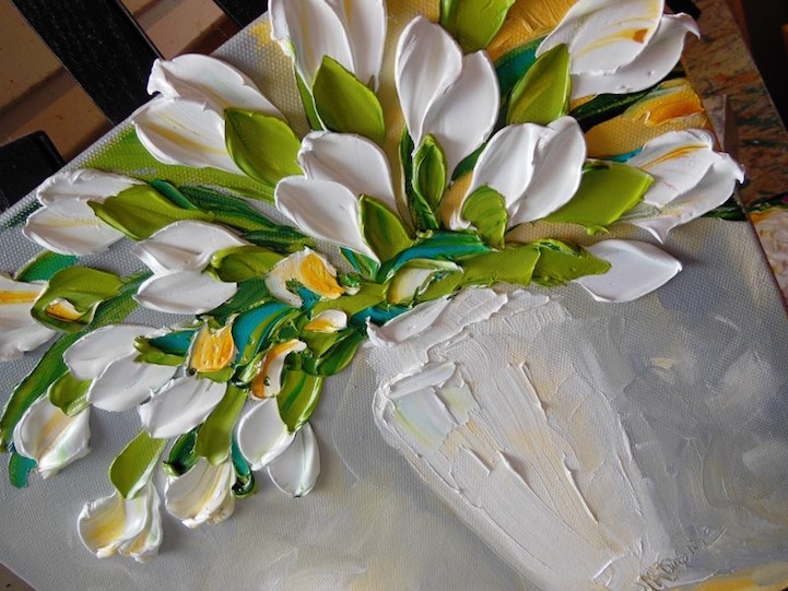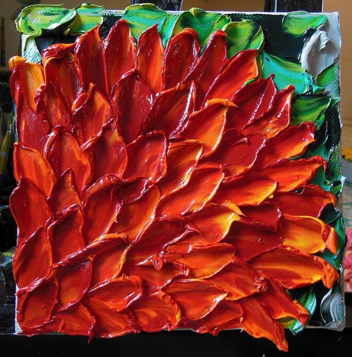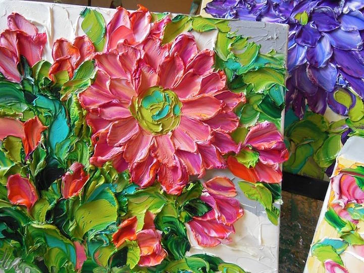 Artist Jane Ironside (of IronsideImpastos) paints flowers that literally pop off the page. Utilizing a distinct impasto style involving layers that impressively resemble flower petals, the creative is able to depict a wide range of blossoms. Ironside does so using a simple palette brush to mix both light and dark colors, which also allows her to play with dimension. She explains that her technique is “just like icing cupcakes!”